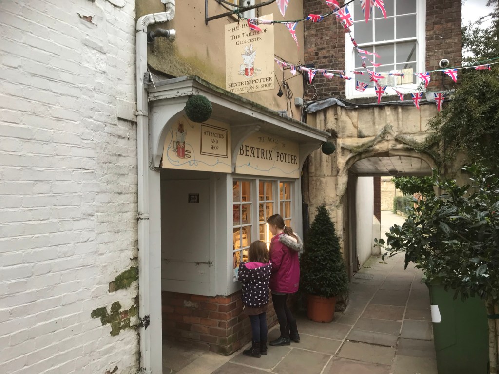 Our main purpose of the day was to pay a visit to the shop of the Tailor of Gloucester. (Picture at top). This proved to be quite as delightful as we’d anticipated.