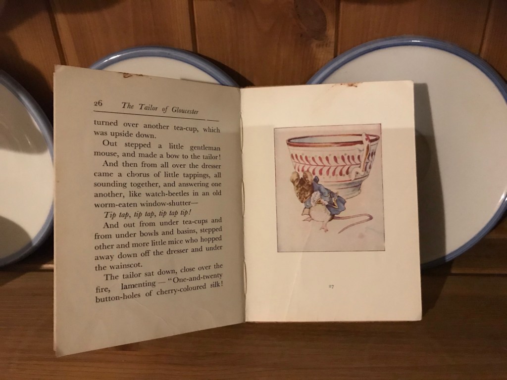 Beatrix Potter visited Gloucester when staying with her cousin nearby, and whilst there heard the strange tale about Mr Pritchard, the tailor. He had been commissioned to make a suit for the mayor. He cut out the fabric and left it in the shop to be made up the following week. However, when he arrived on Monday morning it was finished, all but one button hole. Beside it lay a note saying “no more twist”.