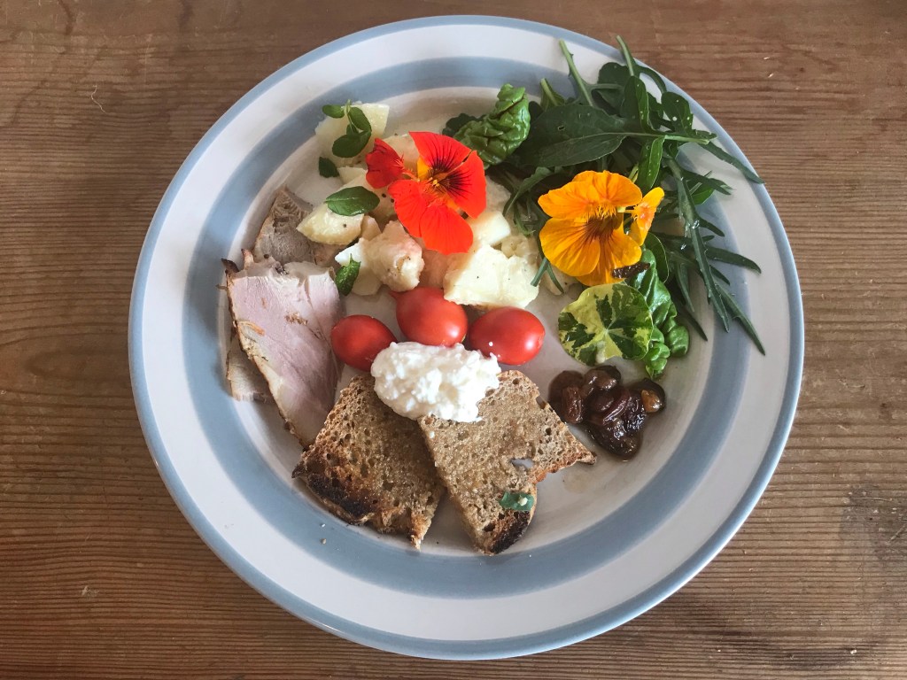 A home grown meal…salad, tomatoes and potatoes from the garden, home raised and cured ham, home made corgette chutney, sourdough and kefir cheese. The sourdough and kefir are fairly recently acquired skills.